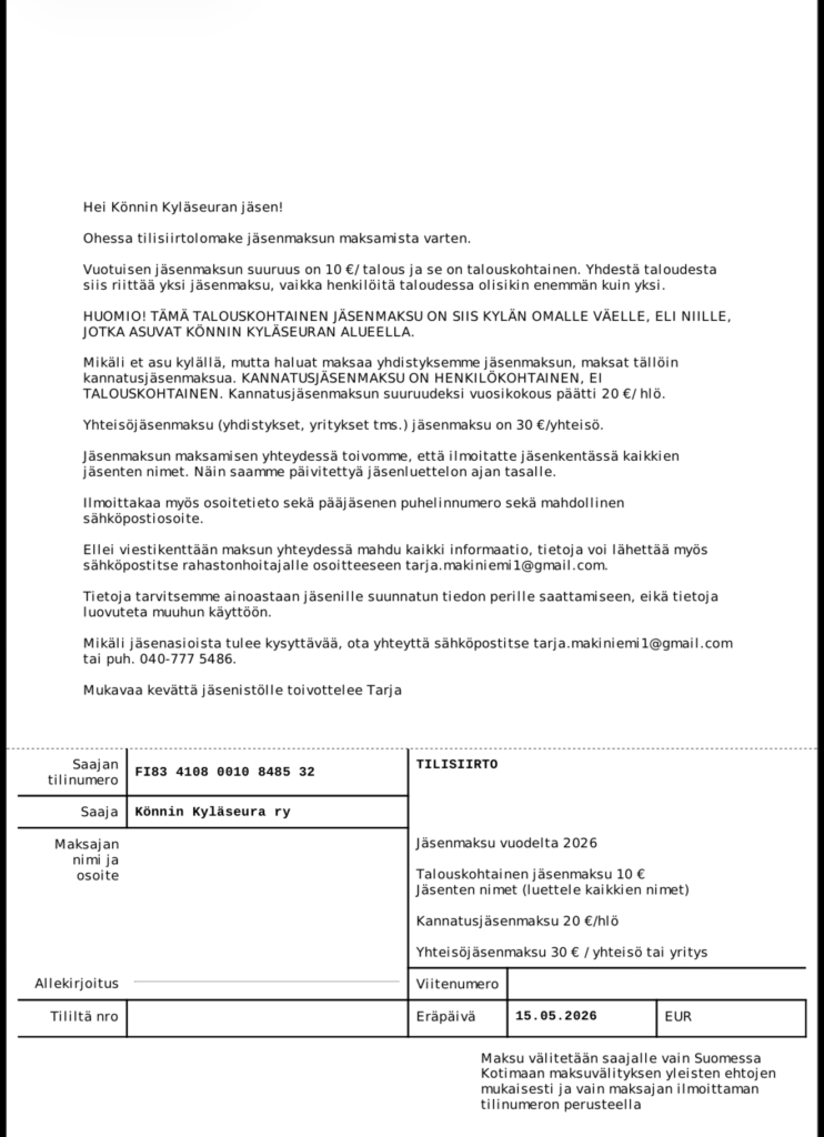 Hei Könnin Kyläseuran jäsen!